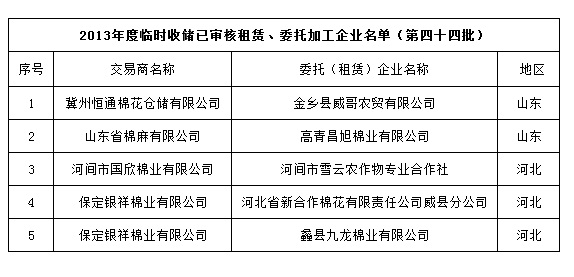 2013年度棉花臨時收儲已審核租賃、委托加工企業(yè)名單(第四十四批)