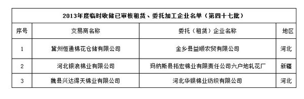 2013年度棉花臨時(shí)收儲(chǔ)已審核租賃、委托加工企業(yè)名單(第四十七批)
