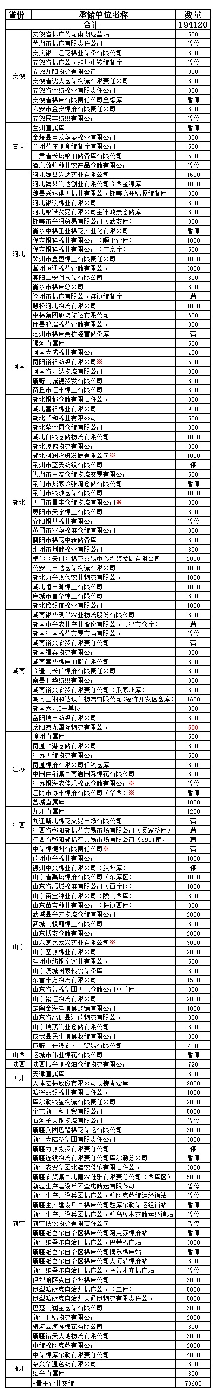 各涉棉企業(yè): 中國儲備棉管理總公司定于12月27日在以下指定倉庫收儲2013年度棉花194120噸(含骨干企業(yè)交儲棉花70600噸)。 為了滿足新疆企業(yè)交儲需要,緩解新疆地區(qū)入庫壓力,在不影響內(nèi)地就近交儲的前提下,以下帶“※”庫點作為內(nèi)地接收新疆棉花交儲的指定庫點。