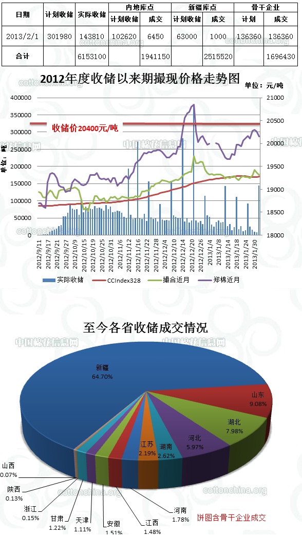 2月1日,計(jì)劃收儲(chǔ)301980噸,實(shí)際成交143810噸,成交比例47.6%,較前一天增加135780噸。其中新疆庫點(diǎn)計(jì)劃收儲(chǔ)63000噸,實(shí)際成交1000噸,成交比例1.6%;內(nèi)地庫計(jì)劃收儲(chǔ)102620噸,實(shí)際成交6450噸,成交比例6.3%;骨干企業(yè)成交136360噸。