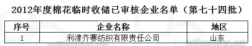 2012年度棉花臨時(shí)收儲(chǔ)已審核企業(yè)名單(第七十四批)