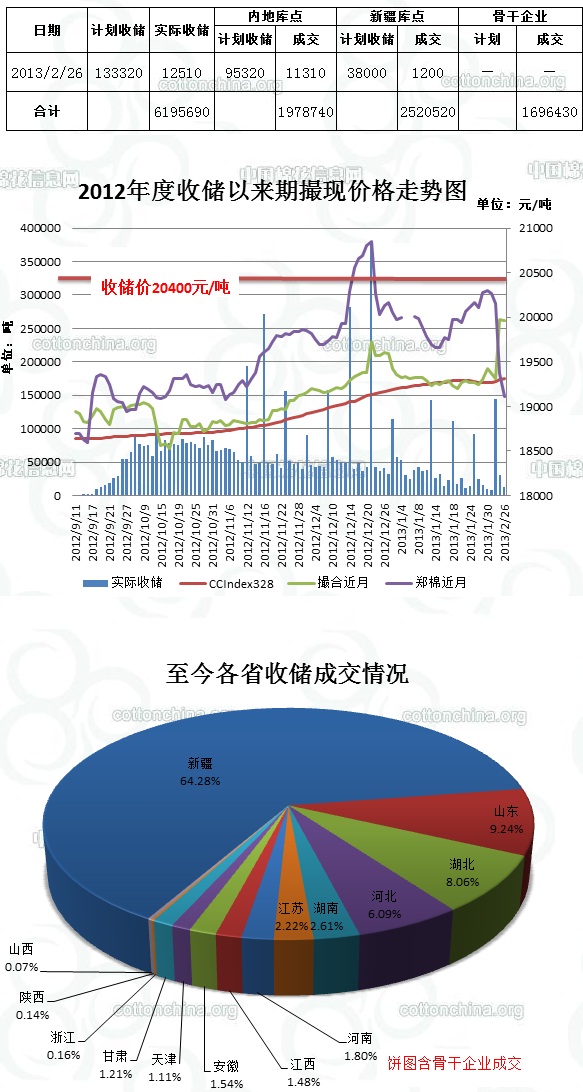 2月26日,計(jì)劃收儲133320噸,實(shí)際成交12510噸,成交比例9.4%,較前一天減少17570噸。其中新疆庫點(diǎn)計(jì)劃收儲38000噸,實(shí)際成交1200噸,成交比例3.2%;內(nèi)地庫計(jì)劃收儲95320噸,實(shí)際成交11310噸,成交比例11.9%。