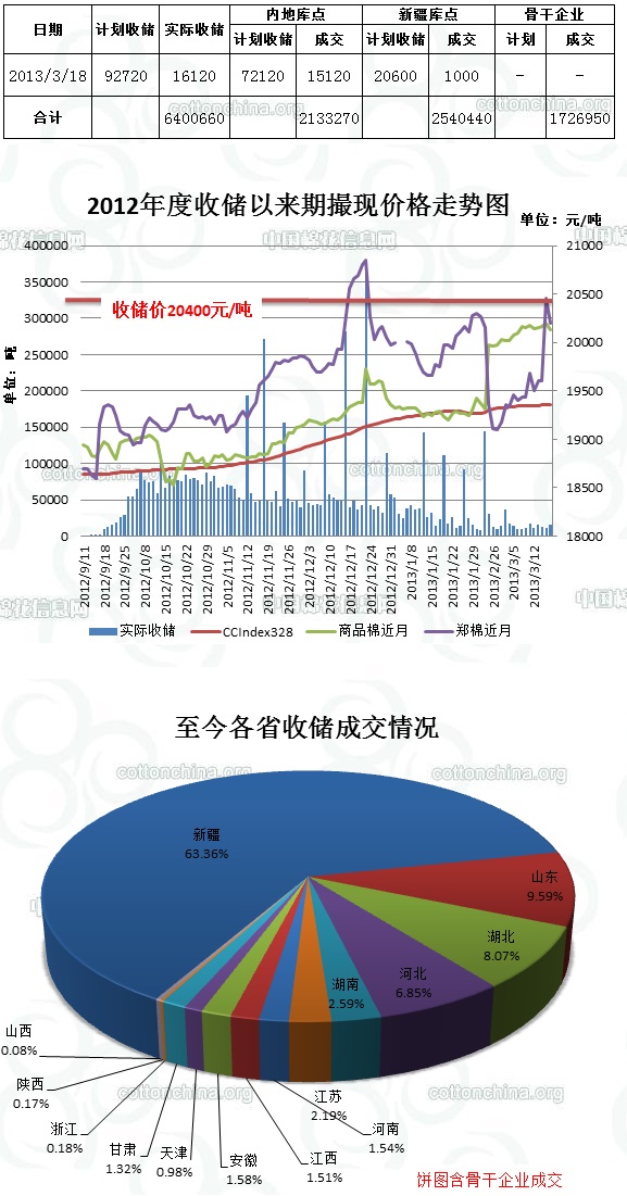 截至今日2012年度棉花臨時收儲累計成交6400660噸,新疆累計成交2540440噸,內(nèi)地累計成交2133270噸,骨干企業(yè)共累計成交1726950噸。
