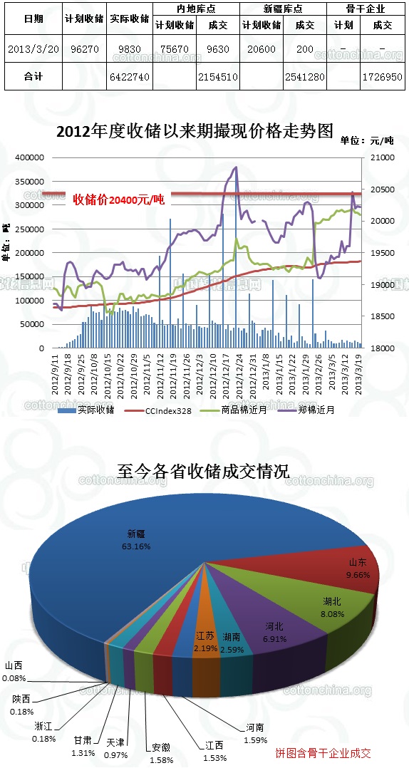 3月20日,計(jì)劃收儲(chǔ)96270噸,實(shí)際成交9830噸,成交比例10.2%,較前一天減少2420噸。其中新疆庫(kù)點(diǎn)計(jì)劃收儲(chǔ)20600噸,實(shí)際成交200噸,成交比例1.0%;內(nèi)地庫(kù)計(jì)劃收儲(chǔ)75670噸,實(shí)際成交9630噸,成交比例12.7%。