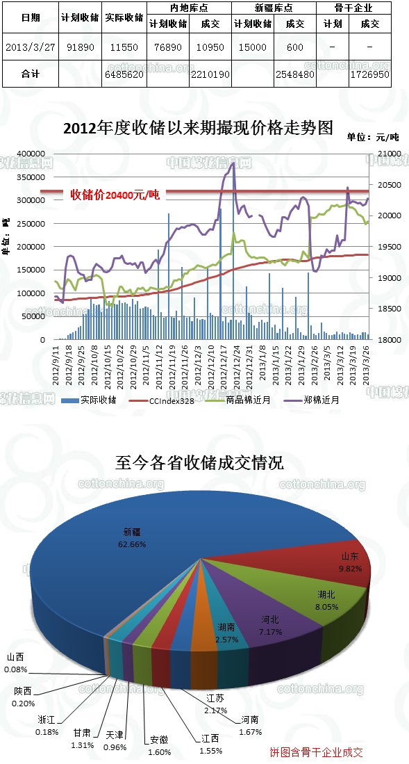 3月27日,計(jì)劃收儲(chǔ)91890噸,實(shí)際成交11550噸,成交比例12.6%,較前一天減少3940噸。其中新疆庫(kù)點(diǎn)計(jì)劃收儲(chǔ)15000噸,實(shí)際成交600噸,成交比例4.0%;內(nèi)地庫(kù)計(jì)劃收儲(chǔ)76890噸,實(shí)際成交10950噸,成交比例14.2%。