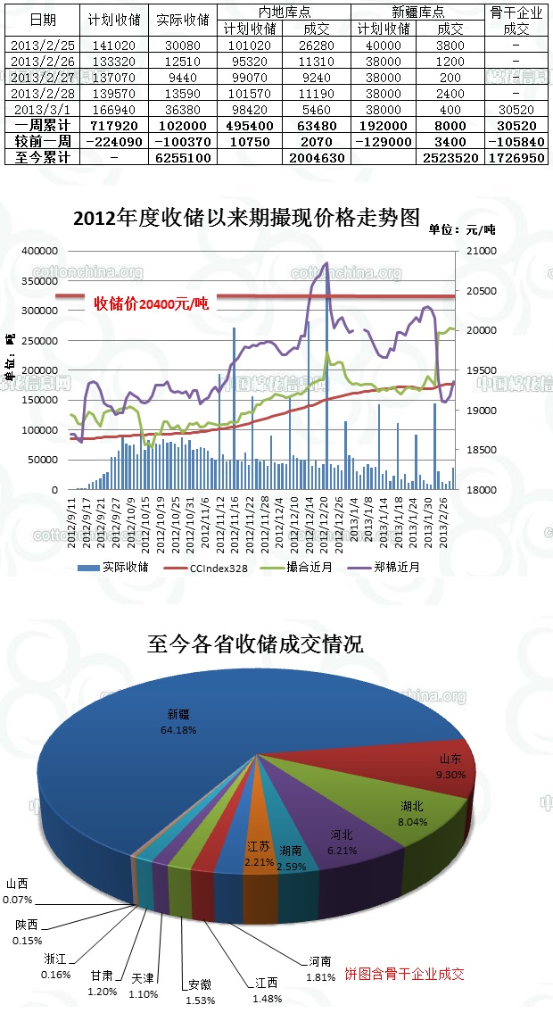 上周(2.25-3.01)共計(jì)劃收儲(chǔ)717920噸,實(shí)際成交102000噸,周成交比例14%;其中內(nèi)地共計(jì)劃收儲(chǔ)495400噸,實(shí)際成交63480噸,較節(jié)前一周增加2070噸,周成交比例13%;新疆共計(jì)劃收儲(chǔ)192000噸,實(shí)際成交8000噸,較節(jié)前一周增加3400噸,周成交比例4.2%。
