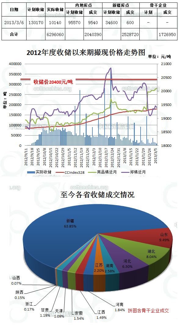 3月6日,計劃收儲130170噸,實(shí)際成交10140噸,成交比例7.8%,較前一天減少3830噸。其中新疆庫點(diǎn)計劃收儲34600噸,實(shí)際成交600噸,成交比例1.7%;內(nèi)地庫計劃收儲95570噸,實(shí)際成交9540噸,成交比例10.0%。