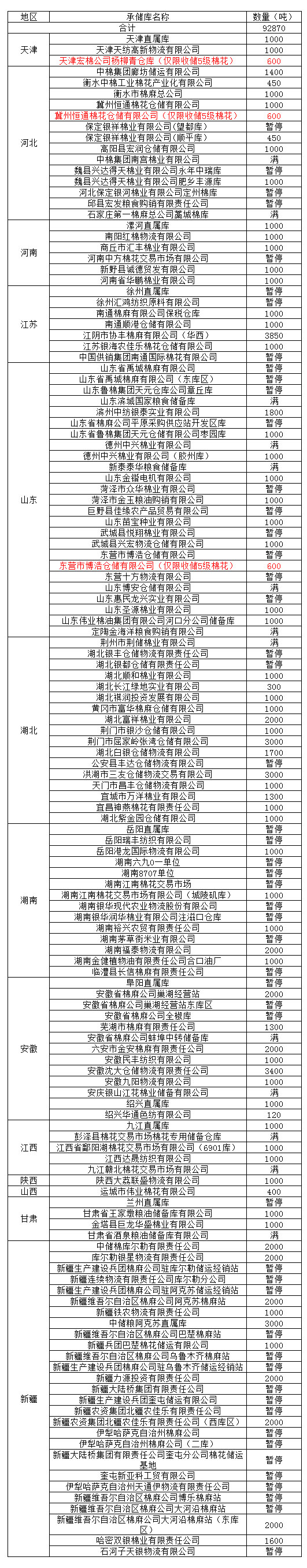 定于3月7日在以下指定倉庫收儲(chǔ)2012年度棉花92870噸。哈密雙銀棉業(yè)有限責(zé)任公司僅限東疆棉花企業(yè)競拍,新疆維吾爾自治區(qū)棉麻公司博樂棉麻站僅限于博樂地區(qū)棉花企業(yè)競拍,以上庫點(diǎn)其他地區(qū)企業(yè)競拍將按違約處理。
