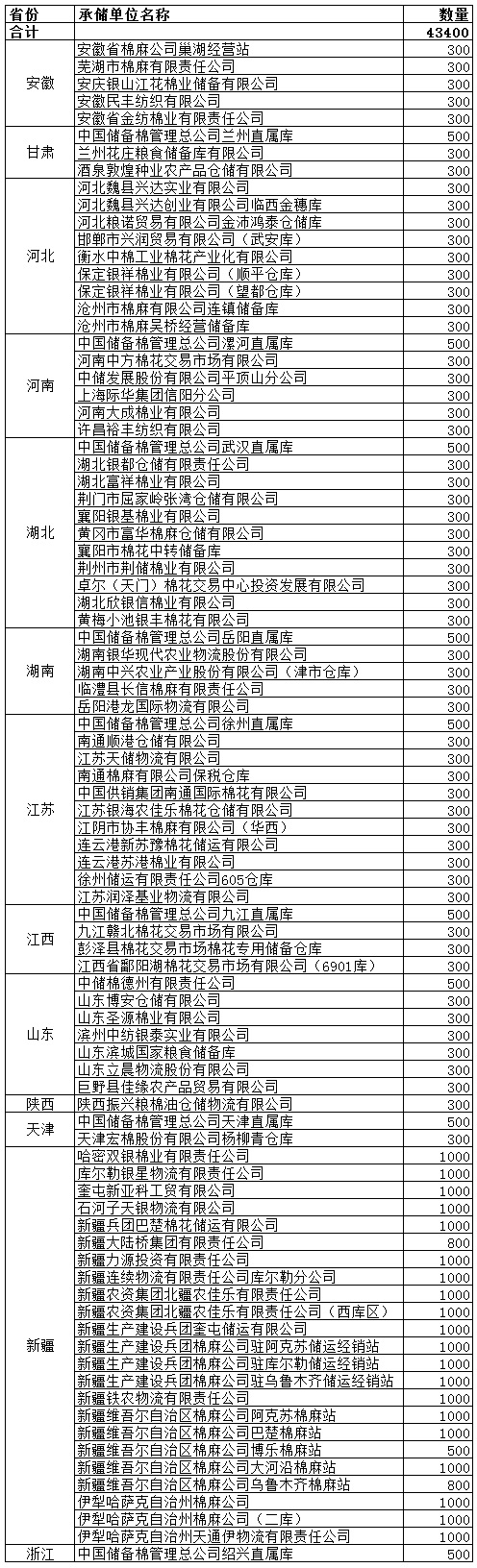 9月16日計(jì)劃在以下指定倉庫收儲(chǔ)2013年度棉花43400噸。