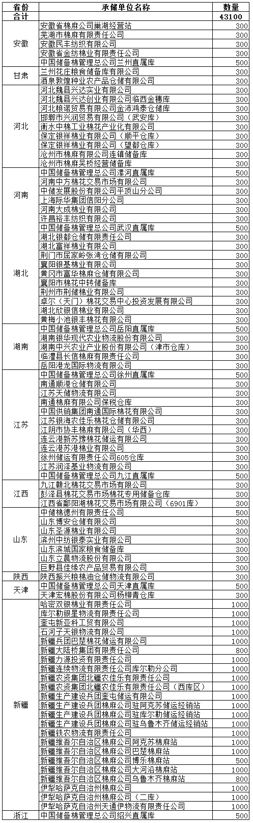 9月17日計(jì)劃在以下指定倉(cāng)庫(kù)收儲(chǔ)2013年度棉花43100噸。