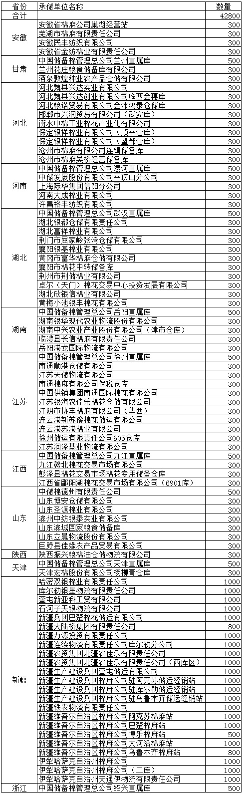 9月23日計劃在以下指定倉庫收儲2013年度棉花42800噸。