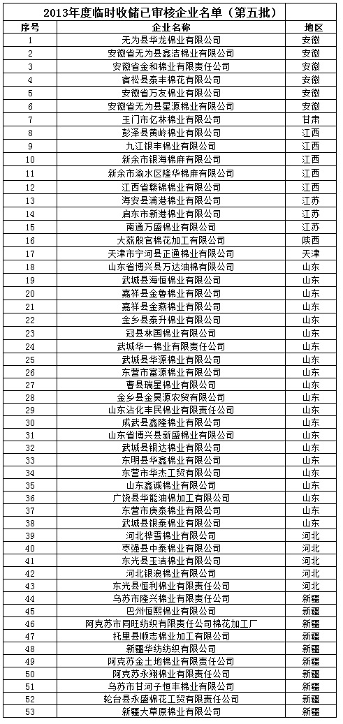 2013年度棉花臨時收儲已審核企業(yè)名單(第五批)
