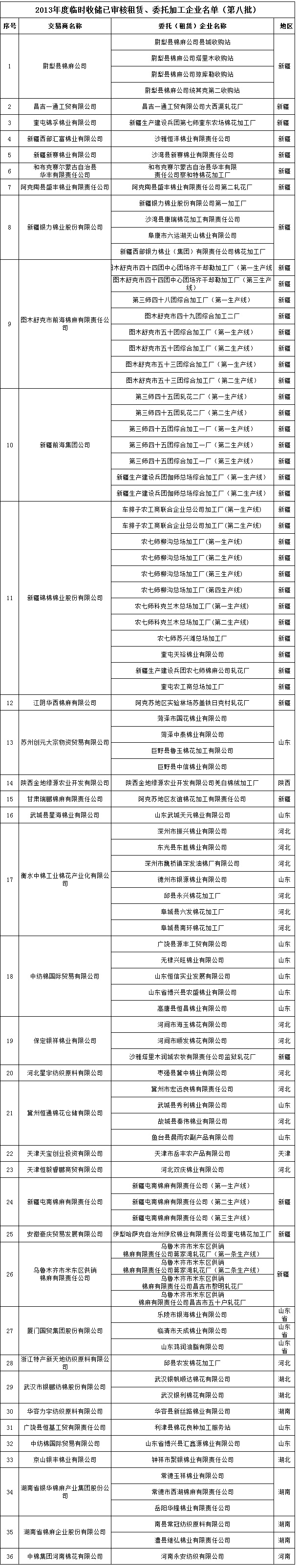 2013年度棉花臨時收儲已審核租賃、委托加工企業(yè)名單(第八批)