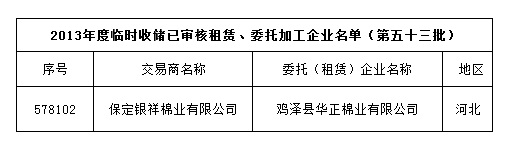 2013年度棉花臨時收儲已審核租賃、委托加工企業(yè)名單(第五十三批)