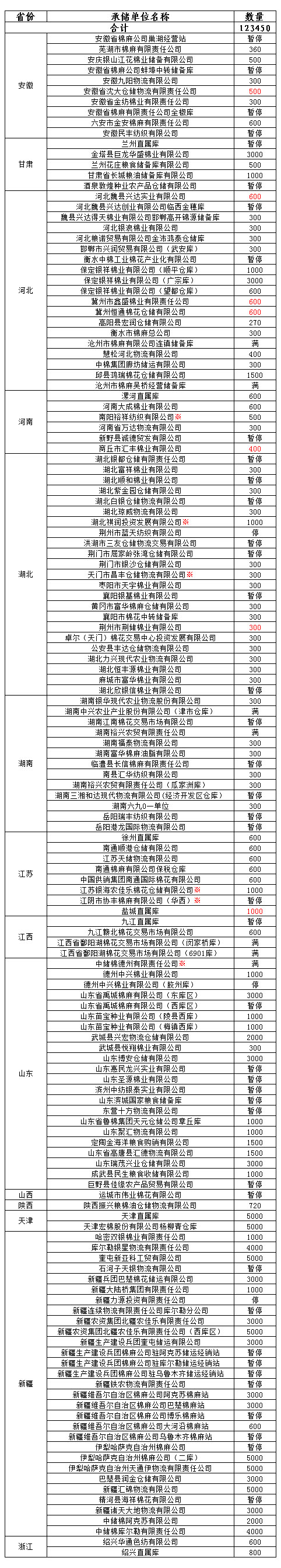 各涉棉企業(yè): 1月21日在以下指定倉庫收儲2013年度棉花123450噸。 為了滿足新疆企業(yè)交儲需要,緩解新疆地區(qū)入庫壓力,在不影響內(nèi)地就近交儲的前提下,以下帶“※”庫點作為內(nèi)地接收新疆棉花交儲的指定庫點。