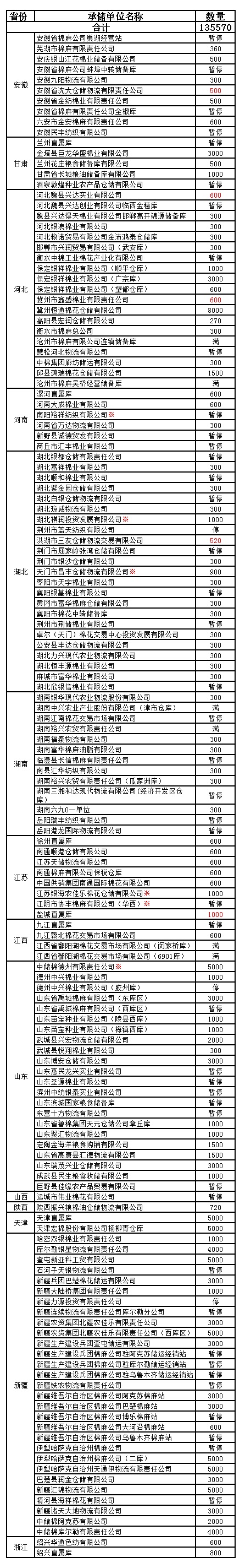 各涉棉企業(yè): 1月22日在以下指定倉庫收儲2013年度棉花135570噸。 為了滿足新疆企業(yè)交儲需要,緩解新疆地區(qū)入庫壓力,在不影響內(nèi)地就近交儲的前提下,以下帶“※”庫點(diǎn)作為內(nèi)地接收新疆棉花交儲的指定庫點(diǎn)。