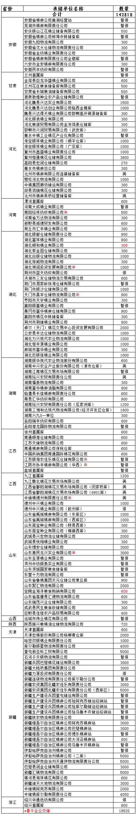 各涉棉企業(yè): 1月6日在以下指定倉(cāng)庫(kù)收儲(chǔ)2013年度棉花142810噸(含骨干企業(yè)交儲(chǔ)棉花18520噸)。 為了滿足新疆企業(yè)交儲(chǔ)需要,緩解新疆地區(qū)入庫(kù)壓力,在不影響內(nèi)地就近交儲(chǔ)的前提下,以下帶“※”庫(kù)點(diǎn)作為內(nèi)地接收新疆棉花交儲(chǔ)的指定庫(kù)點(diǎn)。
