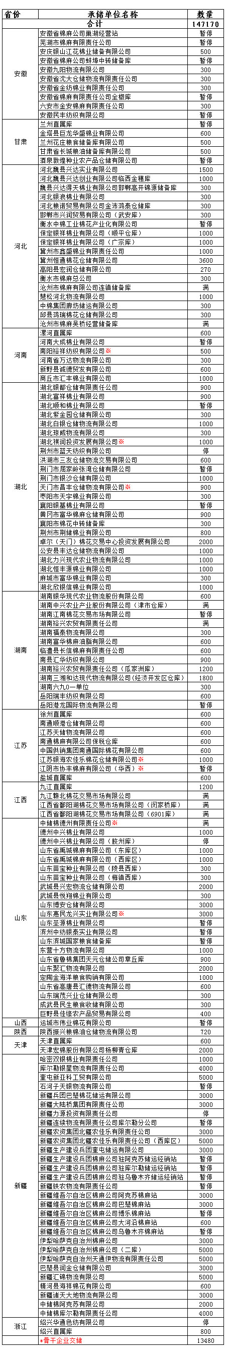 各涉棉企業(yè): 1月7日在以下指定倉庫收儲2013年度棉花147170噸(含骨干企業(yè)交儲棉花13480噸)。 為了滿足新疆企業(yè)交儲需要,緩解新疆地區(qū)入庫壓力,在不影響內地就近交儲的前提下,以下帶“※”庫點作為內地接收新疆棉花交儲的指定庫點。