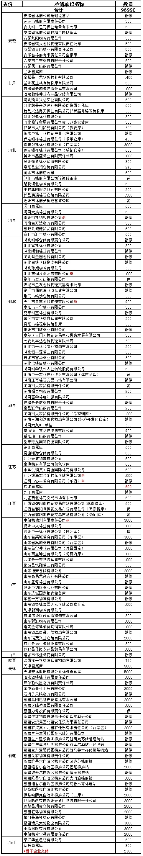 為了滿足新疆企業(yè)交儲需要,緩解新疆地區(qū)入庫壓力,在不影響內(nèi)地就近交儲的前提下,以下帶“※”庫點(diǎn)作為內(nèi)地接收新疆棉花交儲的指定庫點(diǎn)。