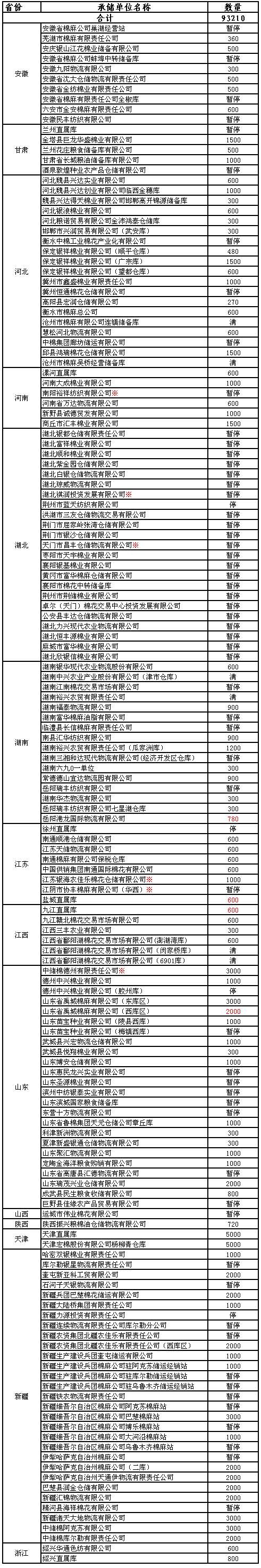 為了滿足新疆企業(yè)交儲(chǔ)需要,緩解新疆地區(qū)入庫(kù)壓力,在不影響內(nèi)地就近交儲(chǔ)的前提下,以下帶“※”庫(kù)點(diǎn)作為內(nèi)地接收新疆棉花交儲(chǔ)的指定庫(kù)點(diǎn)。