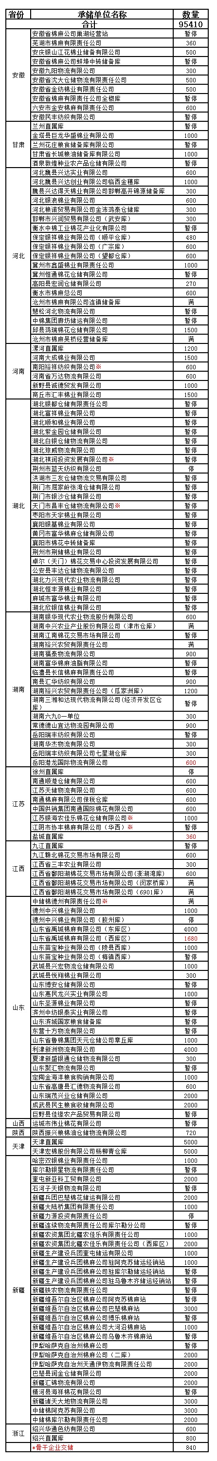 為了滿足新疆企業(yè)交儲需要,緩解新疆地區(qū)入庫壓力,在不影響內(nèi)地就近交儲的前提下,以下帶“※”庫點(diǎn)作為內(nèi)地接收新疆棉花交儲的指定庫點(diǎn)。