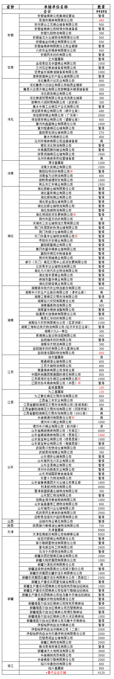 各涉棉企業(yè): 3月14日在以下指定倉庫收儲2013年度棉花99090噸(含骨干企業(yè)交儲棉花6120噸)。 為了滿足新疆企業(yè)交儲需要,緩解新疆地區(qū)入庫壓力,在不影響內(nèi)地就近交儲的前提下,以下帶“※”庫點作為內(nèi)地接收新疆棉花交儲的指定庫點。