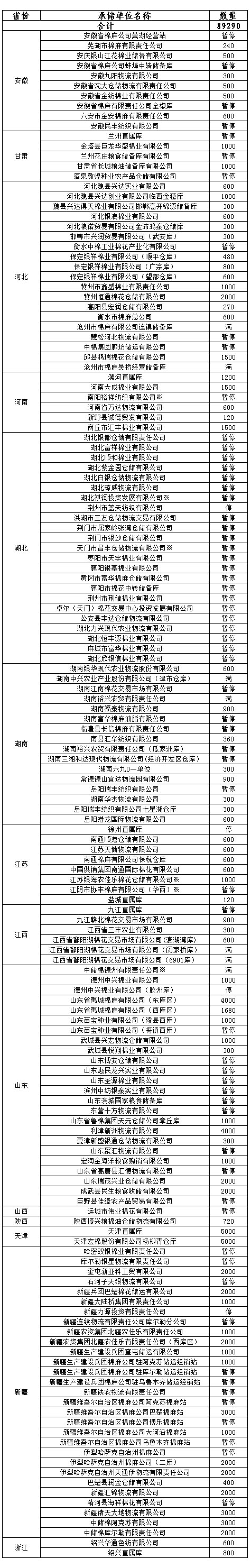 各涉棉企業(yè): 3月26日在以下指定倉庫收儲(chǔ)2013年度棉花89290噸。 為了滿足新疆企業(yè)交儲(chǔ)需要,緩解新疆地區(qū)入庫壓力,在不影響內(nèi)地就近交儲(chǔ)的前提下,以下帶“※”庫點(diǎn)作為內(nèi)地接收新疆棉花交儲(chǔ)的指定庫點(diǎn)。