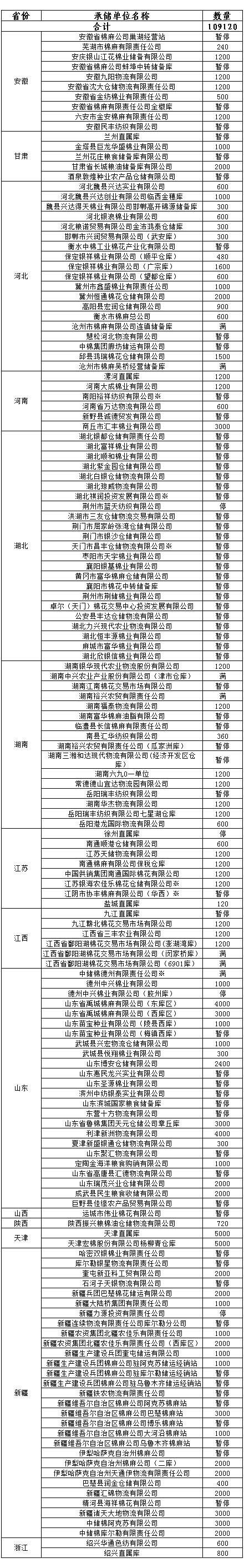 各涉棉企業(yè): 3月31日在以下指定倉庫收儲2013年度棉花109120噸。 為了滿足新疆企業(yè)交儲需要,緩解新疆地區(qū)入庫壓力,在不影響內地就近交儲的前提下,以下帶“※”庫點作為內地接收新疆棉花交儲的指定庫點。