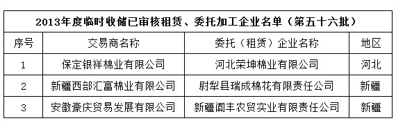 2013年度棉花臨時(shí)收儲(chǔ)已審核租賃、委托加工企業(yè)名單(第五十六批)