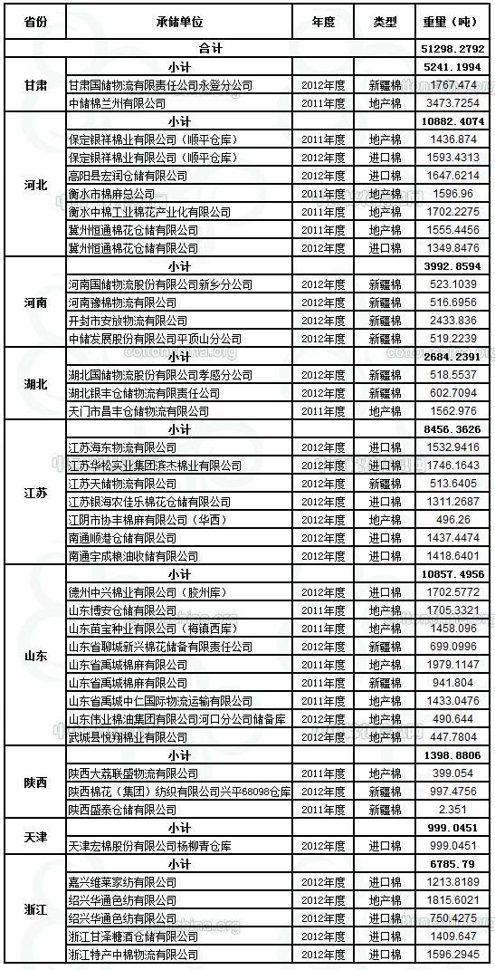 定于8月4日出庫銷售儲備棉51298.2792噸。其中2012年度國產(chǎn)棉12342.0987噸(最低起拍價12790元/噸,捆號47500112513),2012年度進口棉19709.1726噸(最低起拍價13560元/噸,捆號分別為30000212104);2011年度國產(chǎn)棉19247.0079噸(最低起拍價11660元/噸,捆號43170011462)。相關(guān)批次公檢數(shù)據(jù)見附件。具體庫點如下: