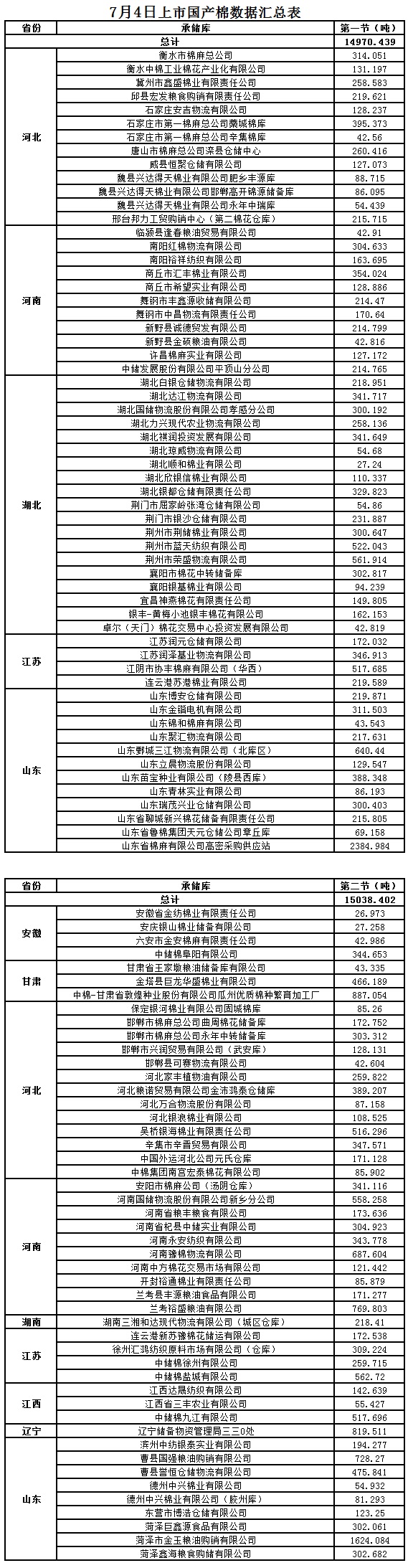 7月4日兩節(jié)共計輪出儲備棉30008.841噸。第一節(jié)計劃輪出儲備棉14970.439噸,其中國產(chǎn)棉14970.439噸、進口棉0噸。第二節(jié)計劃輪出儲備棉15038.402噸,其中國產(chǎn)棉15038.402噸、進口棉0噸。