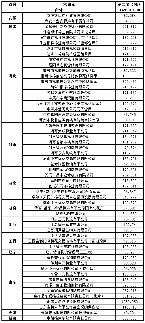 8月1日兩節(jié)共計(jì)輪出儲(chǔ)備棉30018.539噸。第一節(jié)計(jì)劃輪出儲(chǔ)備棉15028.501噸,其中國產(chǎn)棉15028.501噸、進(jìn)口棉0噸。第二節(jié)計(jì)劃輪出儲(chǔ)備棉14990.038噸,其中國產(chǎn)棉14990.038噸、進(jìn)口棉0噸。