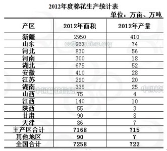 針對(duì)產(chǎn)量綜合分析,新疆種植面積變化巨大,自2012年4月預(yù)計(jì)2450萬(wàn)畝,后來(lái)逐月增加至2012年12月10日公布2750萬(wàn)畝,產(chǎn)量370萬(wàn)噸(新疆棉花收購(gòu)已經(jīng)95%比例),尤其2013年1月9日公布面積2950萬(wàn)畝,產(chǎn)量410萬(wàn)噸。比上個(gè)月面積一下子增加200萬(wàn)畝,產(chǎn)量增加40萬(wàn)噸,超乎預(yù)期和想象(不排除人為或其他因素)。(為做最壞打算,以下計(jì)算均按照預(yù)估的產(chǎn)量計(jì)算)