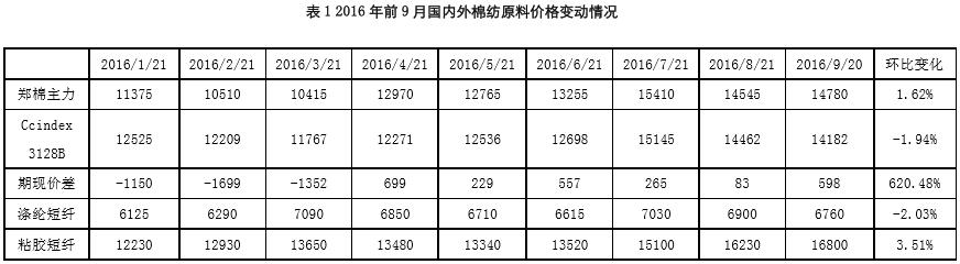 國內棉花,前三季度國內的棉花價格走勢波動劇烈,從年初大家有拋出預期,棉花價格大跌,之后隨著拋儲推遲到5月3日,棉花由于短期緊缺,價格大漲,期貨價格最高超過一萬六,但是隨著之后拋儲投放期延長至9月底,棉花市場價格又開始下跌。本年度儲備棉放出來之后,遭到紡織企業(yè)大搶,由于儲備棉顏色級貼水大,企業(yè)大量競拍底價儲備棉。從今年的棉花生長情況來看,2016年度新疆棉花質量好,單產高,總產預計增加。需求方面,企業(yè)表示前半年國內的紡織服裝經營情況較好,從6月份訂單開始轉差,但是整體的經營情況要好于去年。