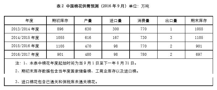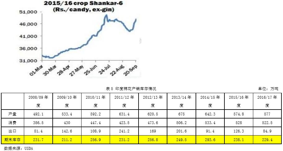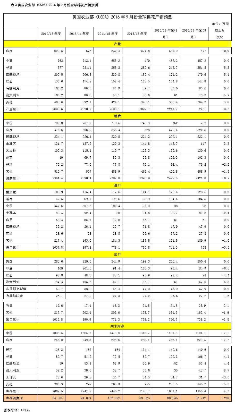 9月公布的2016/17年度平衡表環(huán)比變化:印度棉產量下調10.9萬噸至577萬噸,美國棉產量上調5.8萬噸至351.5萬噸,澳大利亞棉產量上調15.2萬噸至76.2萬噸,全球棉產量上調19.3萬噸至2231萬噸。土耳其用棉量上調3.3萬噸至147萬噸,全球用棉量下調0.7萬噸至2421.8萬噸。土耳其進口量下調2.1萬噸至80.6萬噸。印度出口棉量下調6.5至84.9,澳大利亞出口棉量上調6.5至67.5萬噸。中國棉花庫存下調2.1萬噸至1101.7萬噸,印度棉花庫存下調2.7至229.4萬噸,美棉庫存上調4.4至106.7萬噸,全球庫存上調4.3萬噸至1955.4萬噸。本次報告主要下調印度棉花產量,上調美棉產量,消費量變化不大,小幅上調全球棉花庫存。