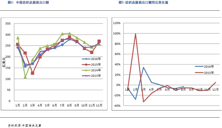 前三季度,我國紡織品服裝出口和全國外貿情況基本一樣,受國際市場需求不佳以及東南亞其他國家的低勞動力成本等因素的擠壓,2016年1-8月,我國累計出口紡織品服裝1783.37億美元,同比減少3.33%,其中出口紡織物718.15億美元,同比減少0.51%;出口服裝1065.22億美元,同比減少5.15%。1-8月份我國出口總值同比下降7.1%(美元值),相對于其他品種,我國紡織品服裝出口情況降幅不大。而8月份紡織品服裝出口數據相對于前幾個月略有好轉,同比減幅縮小。預計第四季度,隨著人民幣貶值預期增加,出口縮減的形式會略有改善。從今年前三季度紡織服裝企業(yè)的經營情況來看,經過前兩年的行業(yè)洗牌,目前行業(yè)內還在經營的企業(yè),大部分都是相對有競爭力的大中型企業(yè),據反映今年的經營情況雖然不如不是特別好,但是和去年相比較,經營情況是有好轉的,因此對于未來的形勢,企業(yè)仍抱有樂觀的態(tài)度。但是從全年來看,2016年紡織品服裝出口額同比減少是大概率事件。