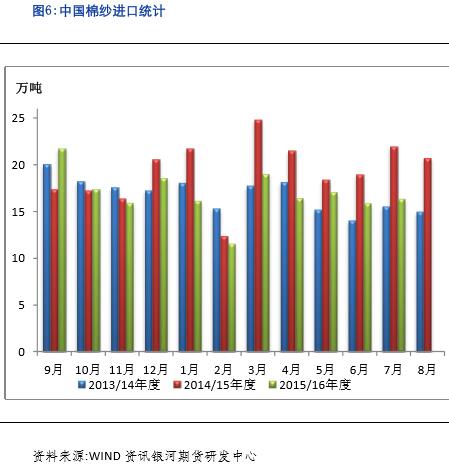 而進口紗方面,由于內外棉價差減小,本年度棉紗進口量也呈現(xiàn)減少趨勢。從海關總署的統(tǒng)計數據來看,1-7月累計進口棉紗112.66萬噸,同比減少19.51%。2015/16年度(2015.9-2016.7)累計進口棉紗線186.45萬噸,同比減少11.92%。隨著國內外棉價差減小,我們預計進口棉紗的優(yōu)勢將逐步減弱,我們仍然推測2016年我國棉紗進口量將在180-200萬噸之間,比去年減30-50萬噸,折合棉花用量為35-55萬噸。