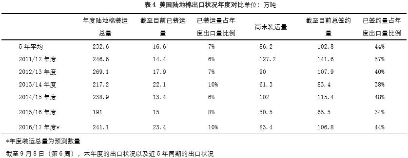 8月新的棉花年度開始,從美棉的產量大增來看,今年美棉銷售壓力巨大,但是從美棉的簽約情況來看,今年美棉的銷售情況目前仍不錯。截止9月15日一周,美國累計簽約2016/17年度陸地棉111.29萬噸,同比增加64.68%,裝運26.97萬噸,美陸地棉的簽約進度為46%,5年平均值為45%,裝運進度為11%,5年平均值為8%。美棉的最大簽約國仍然是越南,其次是土耳其,中國的采購量較前幾年大降。今年美棉產量大增,比去年增產60多萬噸,但是銷售市場變化不大,因此除非美棉在價格優(yōu)勢大于澳棉等,要不然美棉后期預計很難完成銷售任務。