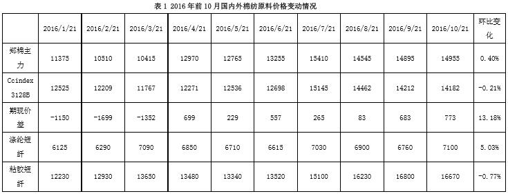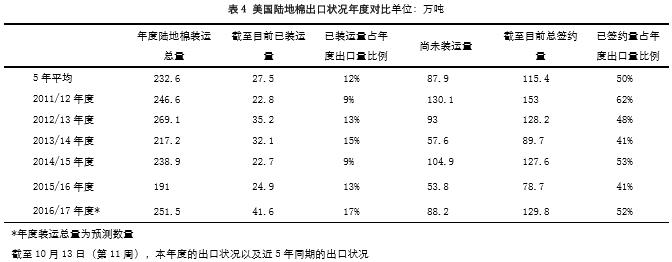 新年度美棉產(chǎn)量大增,銷售壓力增加,但是從目前的情況來看,今年美棉的銷售情況非常不錯。截止10月13日一周美國累計簽約2016/17年度陸地棉129.83萬噸,同比增加65.1%,簽約進(jìn)度為52%,5年平均值為50%,累計裝運陸地棉41.63萬噸,裝運進(jìn)度為17%,5年平均值為12%。值得關(guān)注的是,在美棉銷售中,近期中國的簽約量大增,截止10月13日一周,中國累計簽約美陸地棉量達(dá)15.8萬噸,占總簽約量的12%,而去年同期的簽約量僅2.6萬噸,因此從目前的情況來看,今年中國采購量呈現(xiàn)增長的趨勢。假如最大棉花消費國的中國采購量增加,那么美棉的銷售預(yù)期將更高。