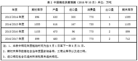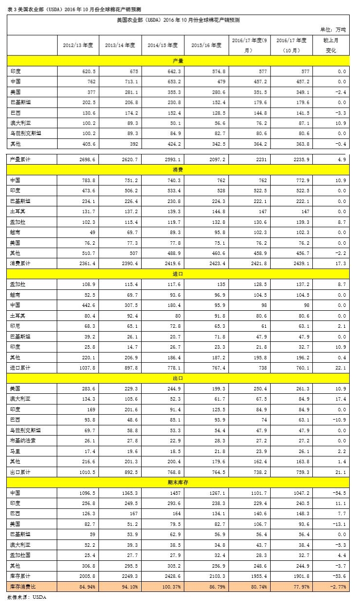 10月USDA公布的2016/17年度平衡表環(huán)比變化:澳大利亞棉產(chǎn)量上調(diào)10.9萬噸至87.1萬噸,美國棉產(chǎn)量下調(diào)2.4萬噸至349.1萬噸,全球棉產(chǎn)量上調(diào)4.9萬噸至2235.9萬噸。中國用棉量上調(diào)10.9萬噸至772.9萬噸,孟加拉國用棉量上調(diào)8.7萬噸至139.3萬噸,全球用棉量上調(diào)17.3萬噸至2439.1萬噸。孟加拉國進(jìn)口量上調(diào)8.7萬噸至137.2萬噸,印度進(jìn)口棉量上調(diào)10.9萬噸至32.7萬噸。美國出口棉量上調(diào)10.9至261.3,澳大利亞出口棉量上調(diào)17.4至84.9萬噸。中國棉花庫存下調(diào)54.5萬噸至1047.2萬噸,印度棉花庫存上調(diào)11.1萬噸至240.5萬噸,美棉庫存下調(diào)13.1至93.6萬噸,全球庫存下調(diào)53.6萬噸至1901.8萬噸。本次報告主要上調(diào)近幾年中國棉花的消費量,從而調(diào)低了中國的期末庫存和全球棉花庫存。