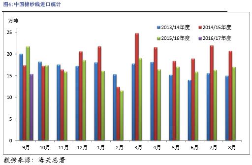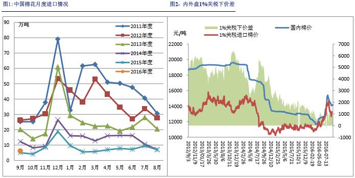 新的棉花年度開始,但是進(jìn)口量仍不大,據(jù)海關(guān)統(tǒng)計,2016年9月我國棉花進(jìn)口量為6.04萬噸,較去年同期增19.47%,較8月進(jìn)口量減少12.82%。由于近期內(nèi)外棉價又有拉大趨勢,而且近期美棉簽約中,中國的簽約量大增,因此,我們預(yù)計2016/17年度,中國進(jìn)口棉花量或有小幅增加。