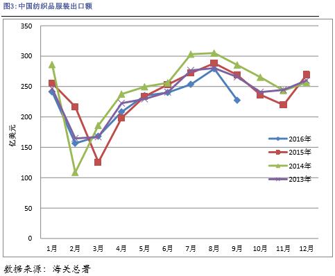 前8個月,我國紡織品服裝出口降幅相對較小,但是9月份降幅突然拉大,宏觀影響因素較大。國際需求環(huán)境不佳,國內(nèi)人工成本較高對制造業(yè)為主要出口產(chǎn)品的中國而言影響較大。另外,當(dāng)其他貨幣相對美元大幅貶值的環(huán)境下,人民幣相對堅挺,對美元變化相對于他貨幣變化較小,也使得我國制造業(yè)的競爭力下降。但是隨著10月份人民幣開啟的新一波的貶值,而且未來仍有貶值預(yù)期,預(yù)計今年后期紡織品服裝出口情況會略有改善。