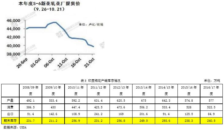 隨著印度新花也陸續(xù)上市,棉花供應(yīng)量增加,印度國內(nèi)的棉價也開始走弱。截止10月20日,印度國內(nèi)S-6新花軋花廠提貨價下降至40000盧比/坎地,折76.44美分/磅。