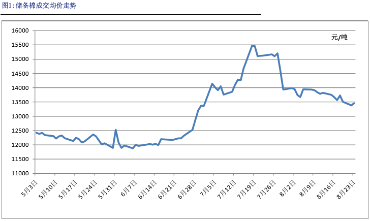 由于儲(chǔ)備棉拋儲(chǔ)期將延期一個(gè)月,國內(nèi)棉花價(jià)格大跌,期貨價(jià)格由之前的16000降到一萬四以下。而棉花儲(chǔ)備棉的競拍均價(jià)也由15500元/噸降到了13500元/噸。以目前ICE期棉價(jià)格來看,預(yù)計(jì)后期儲(chǔ)備棉的競拍底價(jià)仍有下跌空間,但是隨著拋儲(chǔ)進(jìn)入到9月份,而新疆棉初期預(yù)計(jì)銷售價(jià)格不低,部分紡織企業(yè)需要在儲(chǔ)備棉投放結(jié)束之前做備貨準(zhǔn)備,因此預(yù)計(jì)9月份紡織企業(yè)競拍熱情將維持在高位。