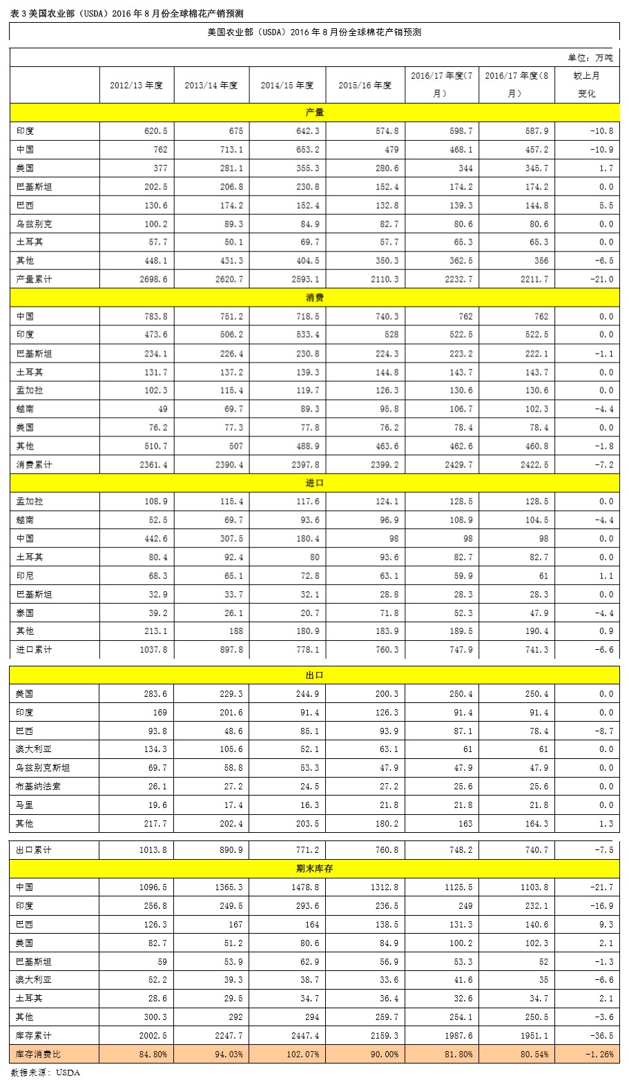 1、全球棉花庫存繼續(xù)減少,中、印庫存減幅大8月公布的2016/17年度平衡表環(huán)比變化:印度棉產(chǎn)量下調(diào)10.8萬噸至587.9萬噸,中國棉花產(chǎn)量下調(diào)10.9萬噸至457.2萬噸,美棉產(chǎn)量上調(diào)1.7萬噸至345.7萬噸,全球棉產(chǎn)量下調(diào)21萬噸至2211.7萬噸。越南用棉量下調(diào)4.4萬噸至102.3萬噸,全球用棉量下調(diào)7.2萬噸至2422.5萬噸。越南進(jìn)口棉量下調(diào)4.4萬噸至104.5萬噸。巴西出口棉量下調(diào)8.7至78.4萬噸。中國棉花庫存大幅下調(diào)21.7萬噸至1103.8萬噸,印度棉花庫存下調(diào)16.9至232.1萬噸,全球庫存大幅下調(diào)36.5萬噸至1951.1萬噸。本次報(bào)告主要下調(diào)印度棉和中國棉產(chǎn)量,大幅下調(diào)中國、印度和全球棉花庫存。