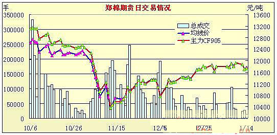 1月14日,鄭棉主力合約CF905高開,早盤空頭回補支撐期價反彈,隨后震蕩走低,午后一度受到空頭打壓下探,但是受到均線支撐回穩(wěn),日線形成陽線星,主要合約成交量萎縮,持倉量略減。C901合約日成交278手,日減倉230手,終盤持倉量4244手;CF905合約日成交12440手,日減倉710手,終盤持倉量44154手;CF907合約日成交474手,日增倉130手,終盤持倉量5844手。 基本面情況:棉花價格小幅下跌,市場表現(xiàn)疲軟成交冷清,皮棉市場多有價無市;紡紗廠陸續(xù)放年假,收購工作基本結(jié)束,部分小紡紗企業(yè)以零星收購當?shù)匦≤埢ㄆっ逓橹?,成交一般?00型的大廠、200型的小廠在心態(tài)上各有春秋,400型大廠尚有收儲可退,而200型小廠則緊看電子盤。春節(jié)期間收儲將暫停三個星期,年前皮棉現(xiàn)貨市場并不樂觀,尚需觀察。籽棉收購市場各地表現(xiàn)不一,有的地區(qū)是價格略有下調(diào),但是收購的數(shù)量較前期持平,也有的地區(qū)棉商提高了收購價格,但是棉農(nóng)賣棉還是不積極,收購量不大。棉副產(chǎn)品價格略有松動,棉籽微跌、棉粕、棉油小幅下跌。 |