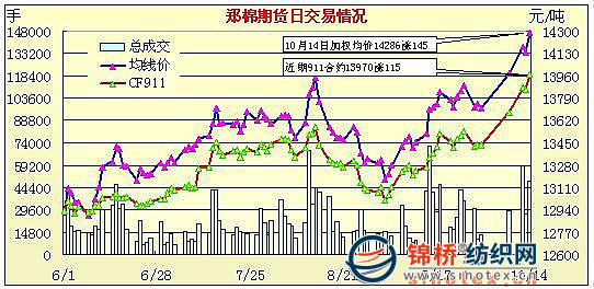 10月14日,鄭棉CF1001合約高開(kāi),早盤(pán)在多頭買(mǎi)盤(pán)推動(dòng)下沖高,隨后形成平盤(pán)震蕩,尾盤(pán)在空頭回補(bǔ)與多頭買(mǎi)盤(pán)支撐下收強(qiáng),日線形成高開(kāi)陽(yáng)線,主要合約成交量放大,持倉(cāng)量增加。CF1001合約日成交38626手,日增倉(cāng)3968手,終盤(pán)持倉(cāng)量53120手;CF1005合約日成交9090手,日增倉(cāng)3849手,終盤(pán)持倉(cāng)量20828手?;久媲闆r:籽棉收購(gòu)價(jià)格價(jià)仍保持繼續(xù)上漲的勢(shì)頭,收購(gòu)市場(chǎng)一片火熱,一些地區(qū)400型的大廠提高收購(gòu)價(jià)格,小廠被迫跟價(jià)。收購(gòu)價(jià)格過(guò)高,使得目前軋花廠收購(gòu)存在一定風(fēng)險(xiǎn),據(jù)了解一些地區(qū)的農(nóng)發(fā)行已經(jīng)開(kāi)始對(duì)目前收購(gòu)企業(yè)限制了最高收購(gòu)價(jià)格,以規(guī)避風(fēng)險(xiǎn)。目前籽棉收購(gòu)加工皮棉,成本已經(jīng)倒掛,許多企業(yè)加工后不急于出售,而是看好后市將棉花存放于儲(chǔ)備庫(kù)。紡織廠為了保證訂單,無(wú)奈面對(duì)偏高的棉價(jià),昨日國(guó)儲(chǔ)棉拋儲(chǔ)折328價(jià)13718,高于當(dāng)日中國(guó)棉花價(jià)格指數(shù)(CC Index328)419元。儲(chǔ)備棉競(jìng)拍激烈,可見(jiàn)市場(chǎng)近期用棉仍然偏緊。 |