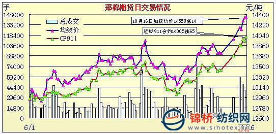 10月16日,鄭棉CF1001合約高開,早盤調(diào)整后受到低位多頭承接買盤支撐回升,午后二次下探,尾盤在空頭回補(bǔ)與多頭買盤的推動(dòng)下收強(qiáng),日線形成高開陽線星,主要合約成交量萎縮,持倉量先增后減。CF1001合約日成交18514手,日增倉86手,終盤持倉量53148手;CF1005合約日成交9722手,日增倉2248手,終盤持倉量25054手?;久媲闆r:棉花市場仍是漲聲疊起,外盤期貨仍維持大漲,內(nèi)盤撮合也上漲百元,撮合的大漲足可以說明目前現(xiàn)貨的強(qiáng)勢。紡企購棉積極,都主動(dòng)到棉廠談價(jià)提貨,三級棉上門提貨價(jià)已漲至13600元/噸,新疆站臺(tái)提貨,毛重13750元/噸。多數(shù)棉廠見此狀況,更加提高了囤棉信心,一般已經(jīng)暫不報(bào)價(jià)。某大型紡織廠采購稱,二天時(shí)間沒能采購到一噸棉花。今日山東籽棉最高價(jià)格屬利津地區(qū),已達(dá)到3.4元/斤。據(jù)悉,部分地區(qū)農(nóng)發(fā)行為了控制價(jià)格,已經(jīng)開始限價(jià),限貸款。