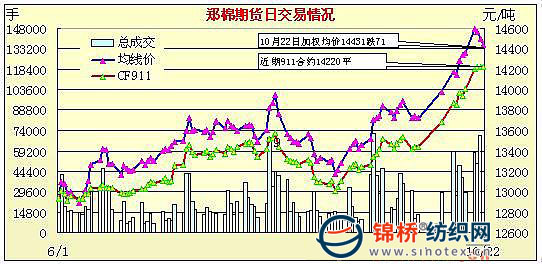 10月22日,鄭棉主要合約CF1001、CF1005小幅高開,早盤在空頭回補(bǔ)支撐下反彈,隨后多頭平倉打壓期價(jià)創(chuàng)日低,午前遠(yuǎn)期合約在逢低買盤推動下回升,帶動近月午后反彈,日線形成高開星線,主要合約成交量萎縮,持倉量近減遠(yuǎn)增。CF1001合約日成交41040手,日減倉5422手,終盤持倉量52974手;CF1005合約日成交16990手,日減倉1168手,終盤持倉量30602手。基本面情況:棉副產(chǎn)品行情維持上漲,籽棉大部分地區(qū)已收到3.3-3.5元/斤。雖有部分加工廠停止收購,但搶購仍在持續(xù)。棉企囤棉惜售,皮棉成交稀少,提貨價(jià)普遍在13900-14000元/噸,銷售幾乎無利潤。受部分大型紡企已拿到少量配額影響,今日國內(nèi)電子盤價(jià)格出現(xiàn)振蕩下跌。現(xiàn)貨價(jià)格仍維持小幅上漲,部分中間商囤積皮棉也較為積極。