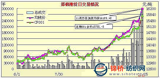 11月25日,鄭棉CF1005合約小幅高開,早盤沖高后在空頭賣盤打壓下回落,隨后區(qū)間盤整,午后快速下滑測(cè)試短線支撐位反彈,交投重心較午前下移整理,尾盤在空頭回補(bǔ)的支撐下反彈,日線形成陰線,主要合約成交量再創(chuàng)新高,持倉大量增加。CF1001合約日成交6470手,日減倉838手,終盤持倉量22986手;CF1005合約日成交501842手,日增倉18788手,終盤持倉量203128手?;久媲闆r:紡企、棉商都大幅上調(diào)了采購價(jià)格。山東某大型紡企三級(jí)棉調(diào)到15000元/噸,湖北某大型棉商三級(jí)棉調(diào)到了14970元/噸?,F(xiàn)貨價(jià)格猛漲,激起了加工廠收購熱情,籽棉收購進(jìn)度加快,價(jià)格續(xù)漲,但后期花質(zhì)量較差,多為四、五級(jí)。另據(jù)調(diào)查,目前新疆大部分加工廠都仍在收購,籽棉價(jià)格較前期上調(diào),在6.2-6.6元/公斤,收購上的籽花等級(jí)質(zhì)量下降,主要為三、四級(jí),多數(shù)棉企囤棉未售。 |
